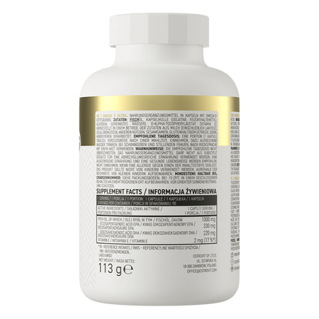 Die Docosahexaensäure (DHA) im OstroVit Omega 3 Ultra unterstützt die normale Gehirnfunktion und hilft, das Sehvermögen zu erhalten. Eicosapentaensäure (EPA) und DHA tragen zur normalen Herzfunktion bei, wobei der Verzehr von 250 mg EPA und DHA pro Tag positive Effekte hat. Das verwendete Vitamin E schützt die Zellen vor oxidativem Stress.